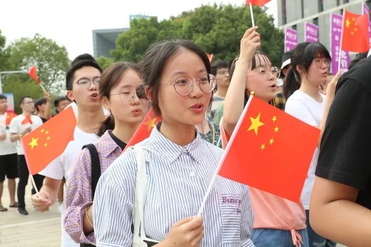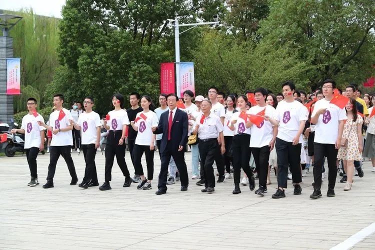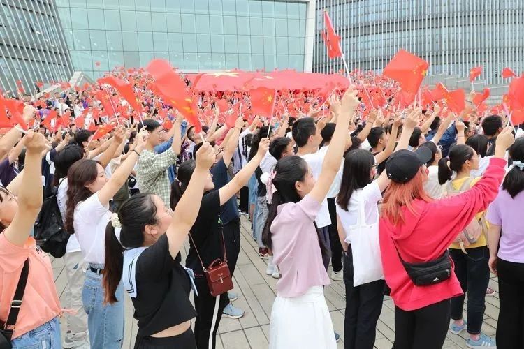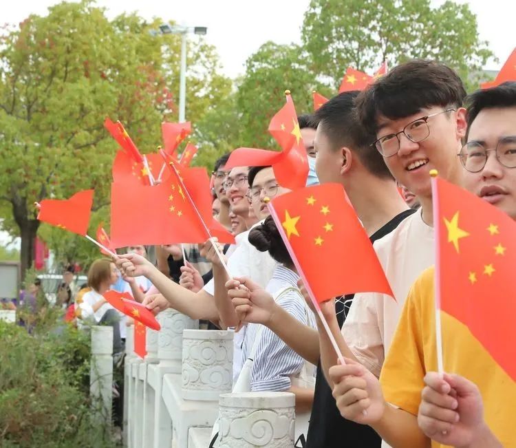 图书馆门前歌声渐渐响起,《我的祖国》动人旋律拨动着每个人的心房。南大学子和领唱嘉宾挥动着手中的国旗从四面八方向我们走来。